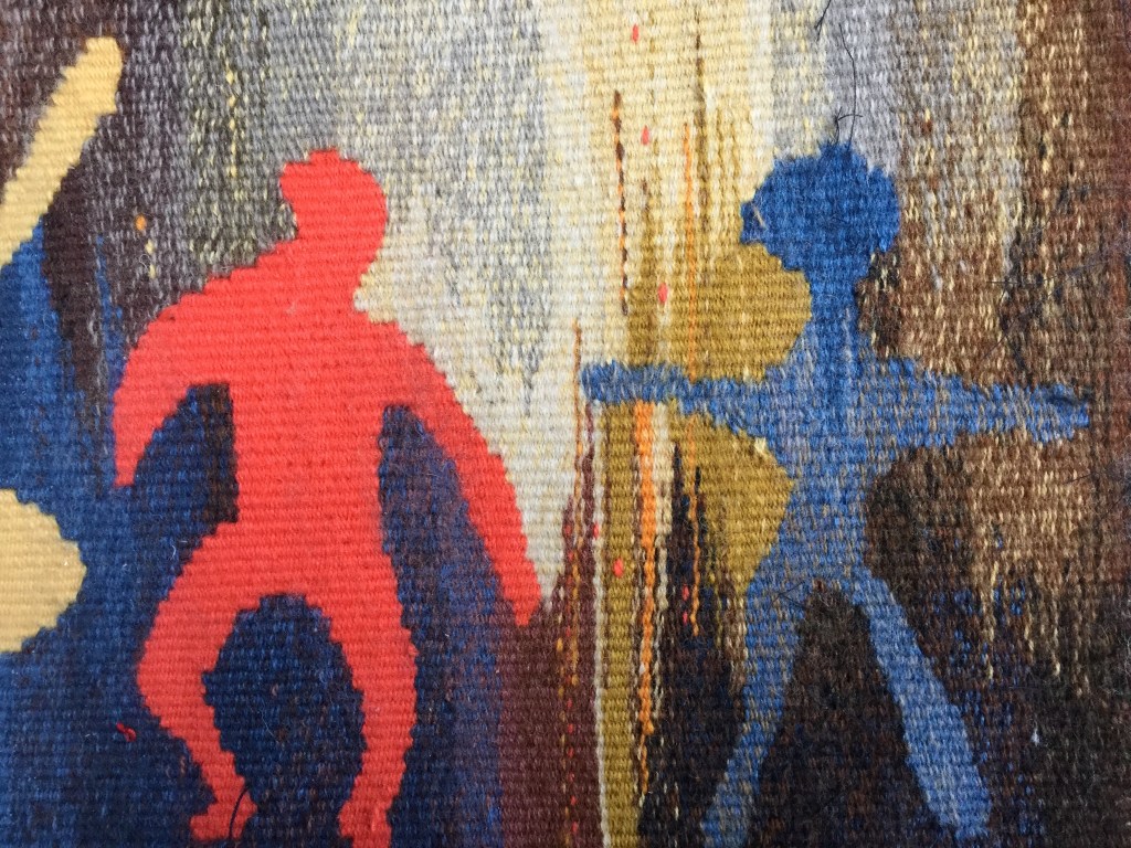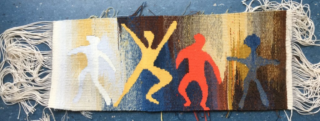 I learnt a lot. It was the first time I wove from the side, and so the first time I had to deal with so many curves. Due to my job, there was a gap of two weeks between the first three dancers and the last on. As I hadn’t any plans, at the end of the weaving, I had lost track of my initial decisions, and there may be a lack of coherence between the beginning and the end, and the width at the end is 1,5cm less than at the beginning. The whole piece is about 20×50 cm. (Roughly 10×20 inches)