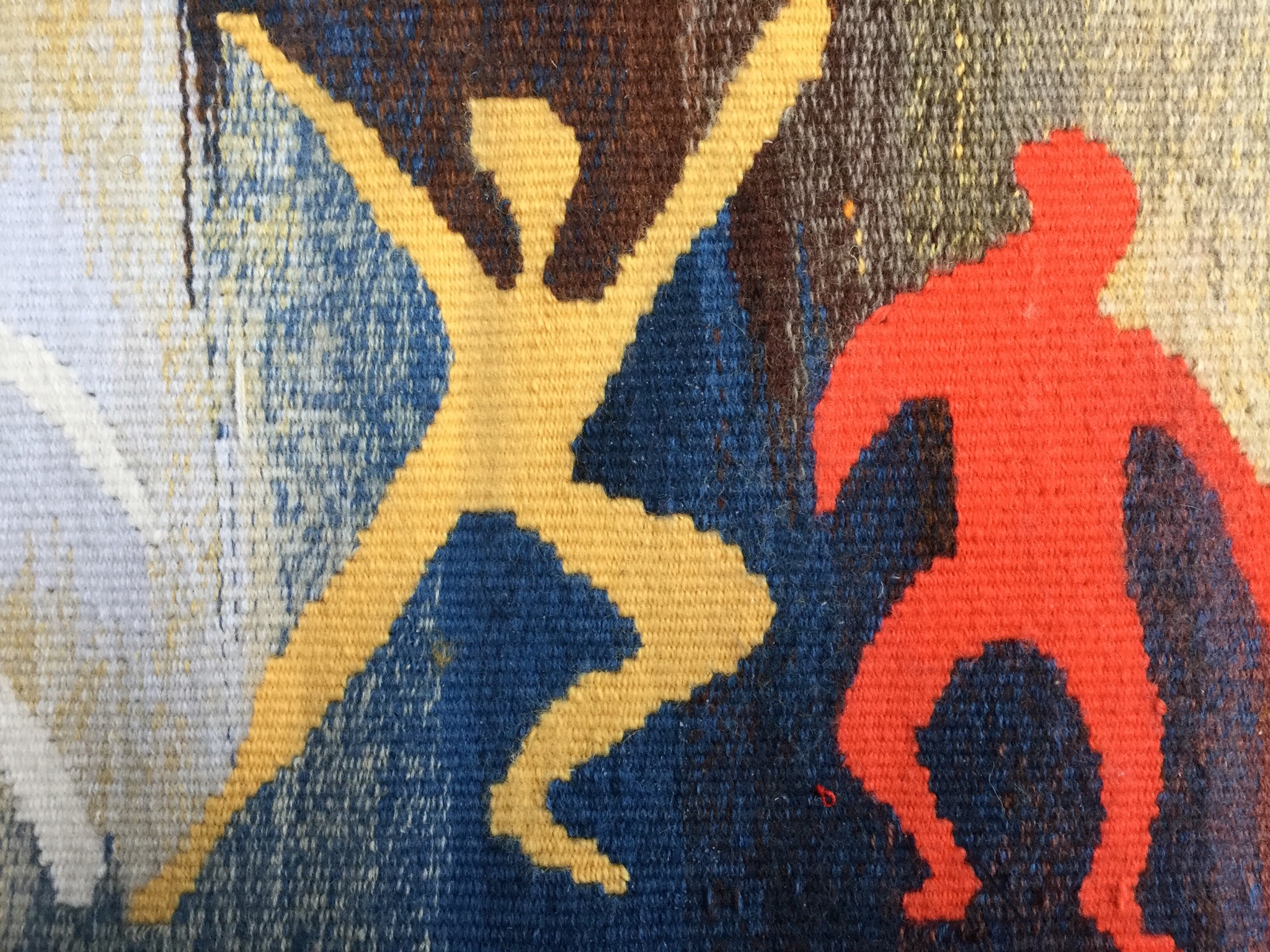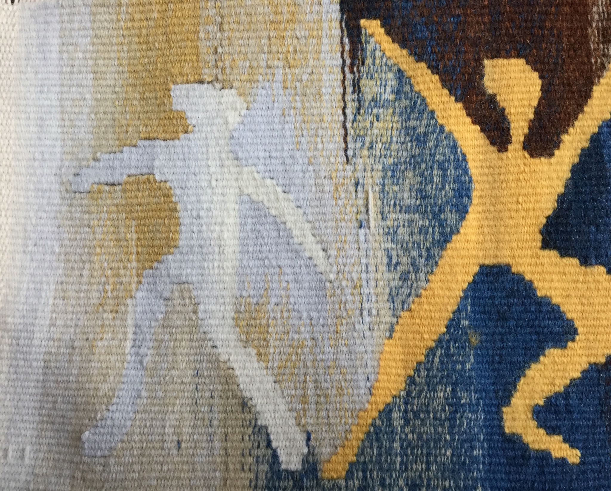 Done. Could have been smoother on the curves, but I am happy of the colors, the orange doesn’t seem to come from nowhere. I a going on with the chiné and the irregular hatching, sometimes struggling because I’m using different kinds and thickness of wool ( I’m blending Faro, Weaversbazar and Aubusson, that’s a mess). Let’s go for the yellow dancer!