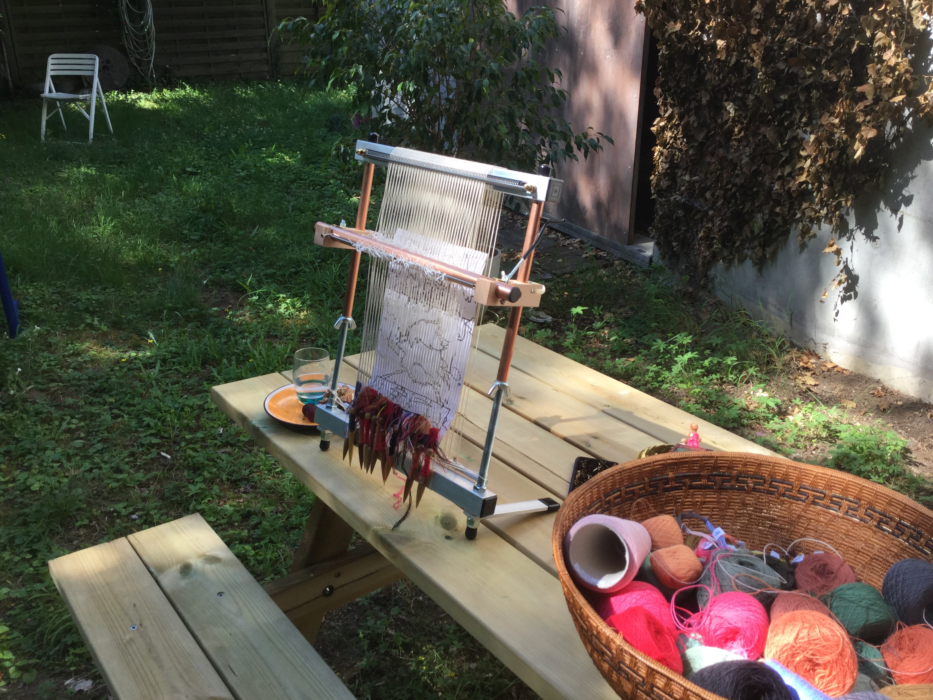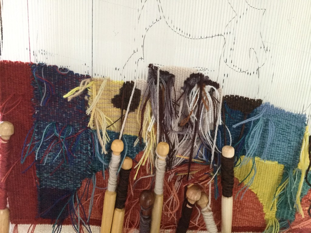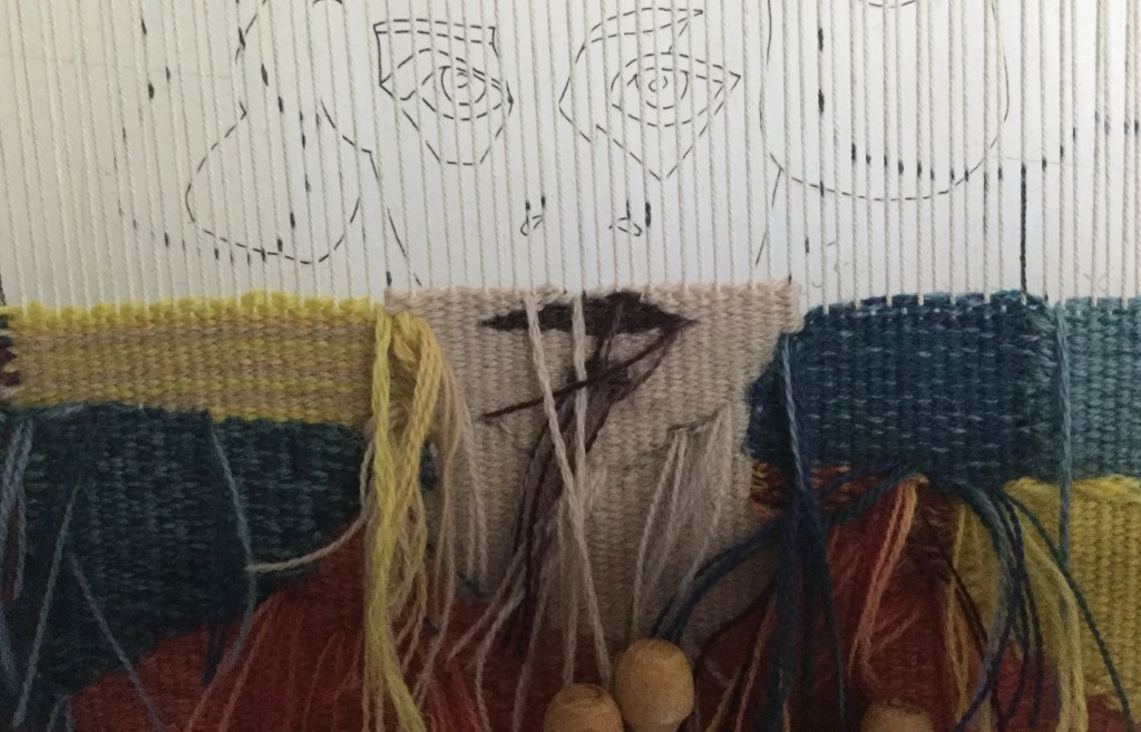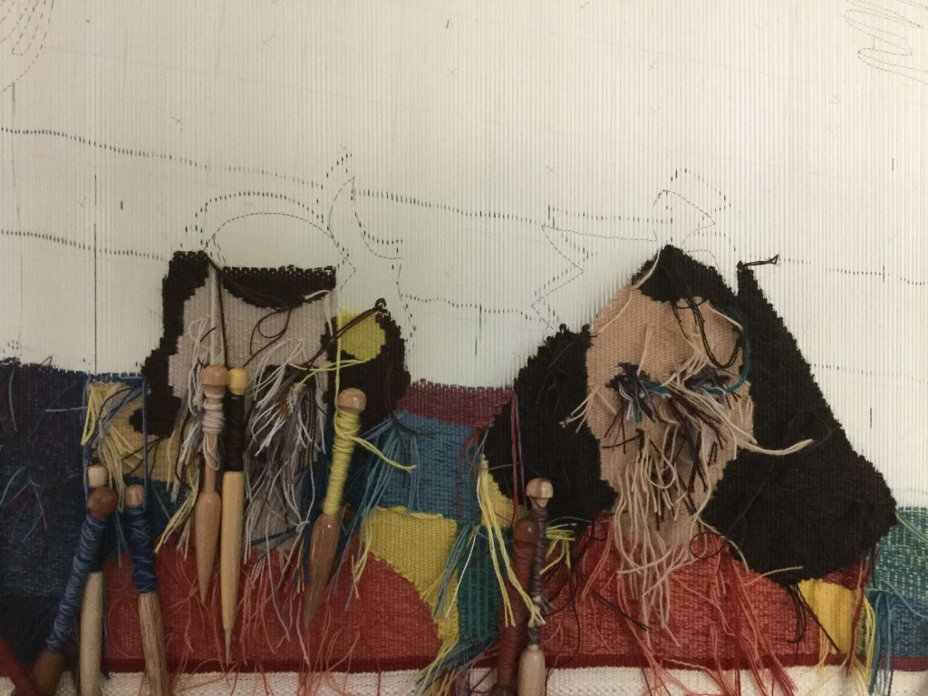 The weaving is going slowly, as I have diiferent projects on the go. It won’t be finished before autum comes. Faces are done anyway, and hopefully better done that the first ones. I must admit that I am less disappointed on the first Alice et Anita now. I like them more. However, I wove the AA2 faces differently, and at a finer sett, I am curious to see what will come of it. Another decison to take ( or unweave): yellow or white ribbons?