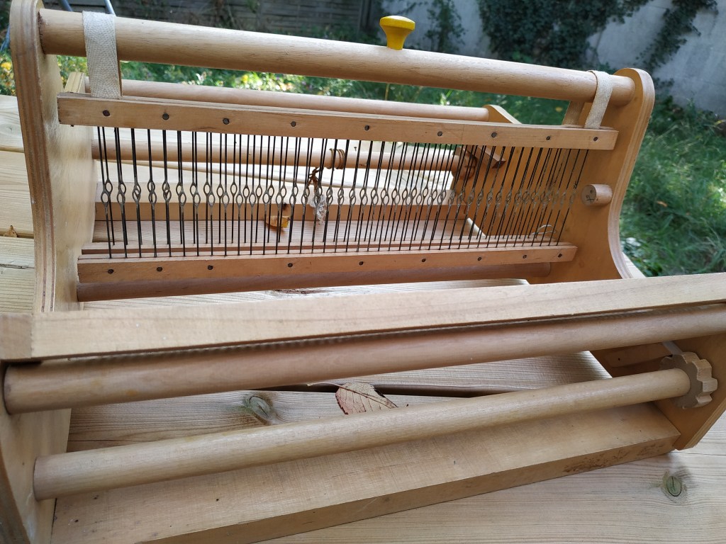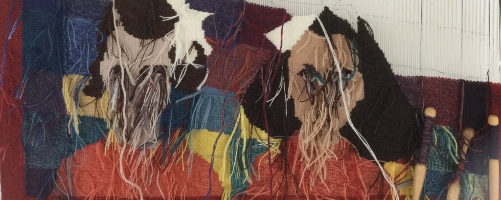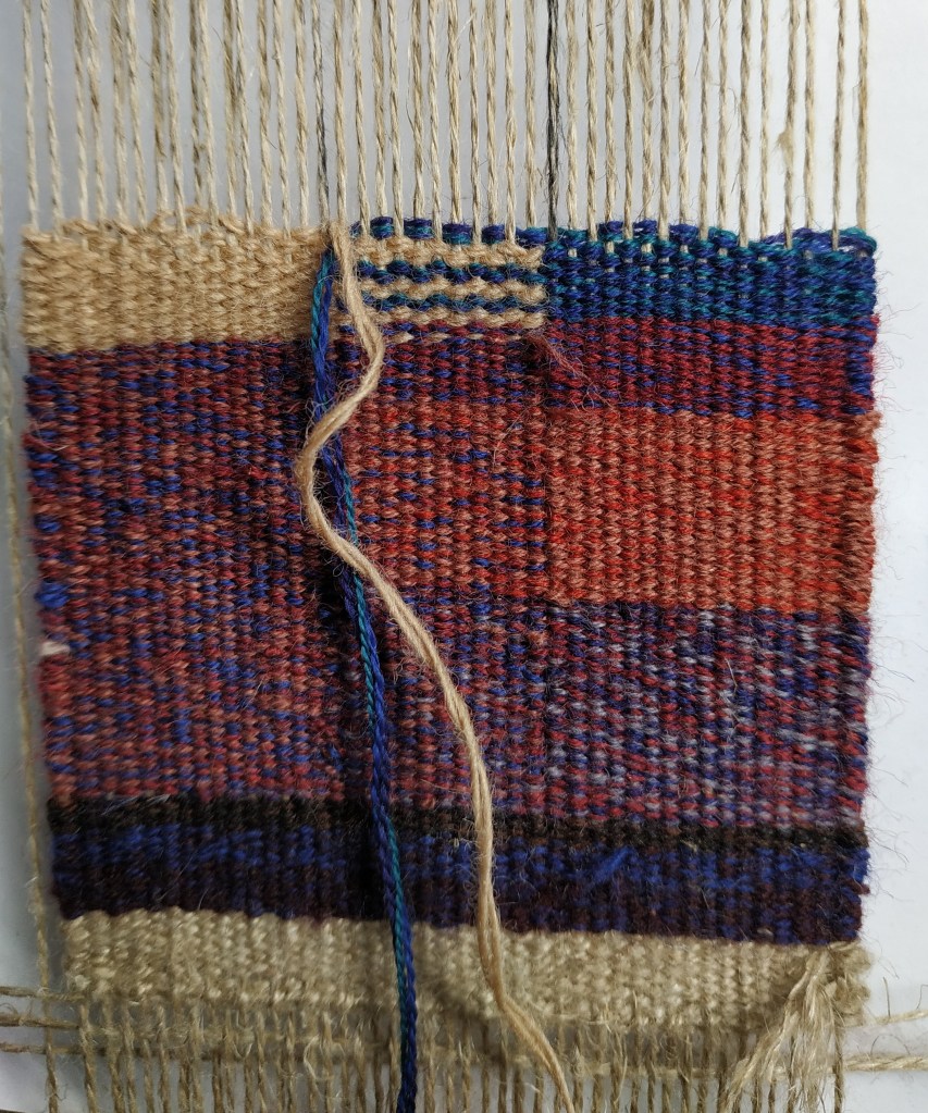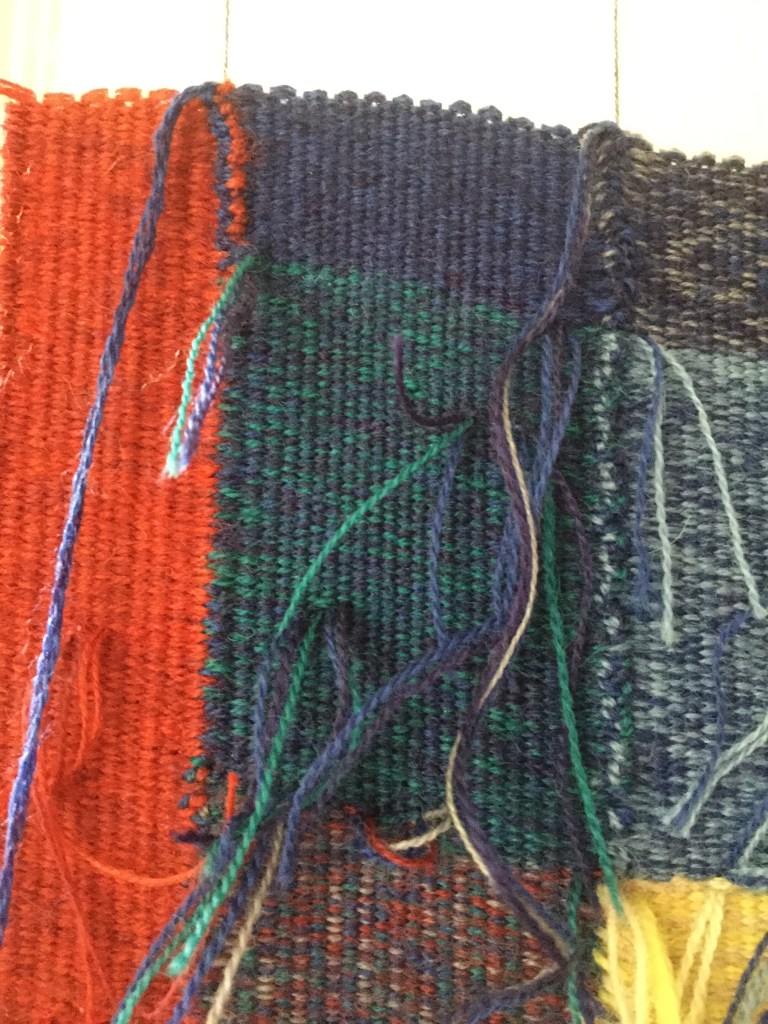 Je me suis lancée dans un crobard, en me donnant des règles : pas de carton, tissage à main levée, pas de bouts qui traînent, et tisser de face. En plus, il y a un paquet de lignes verticales, que j’essaie de négocier à la scandinave. Si tout va bien, il sera fini la semaine prochaine.