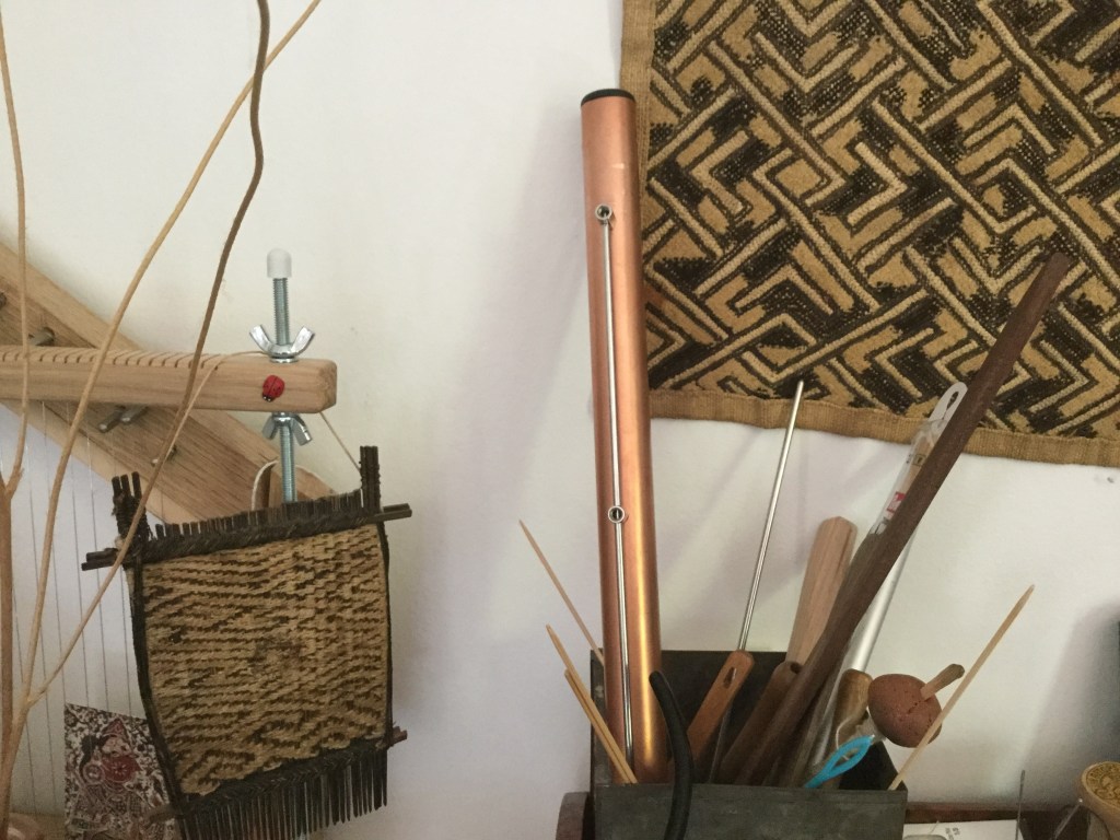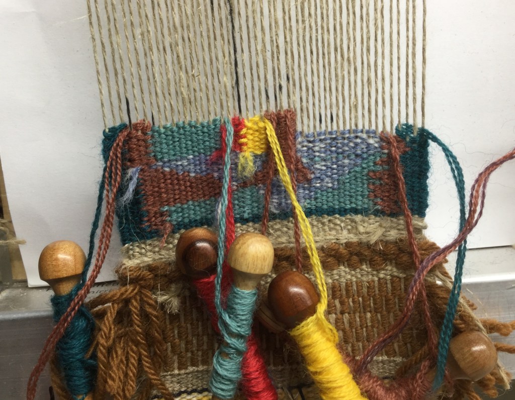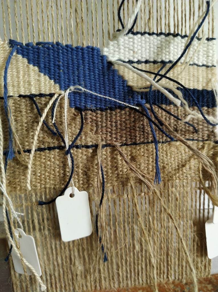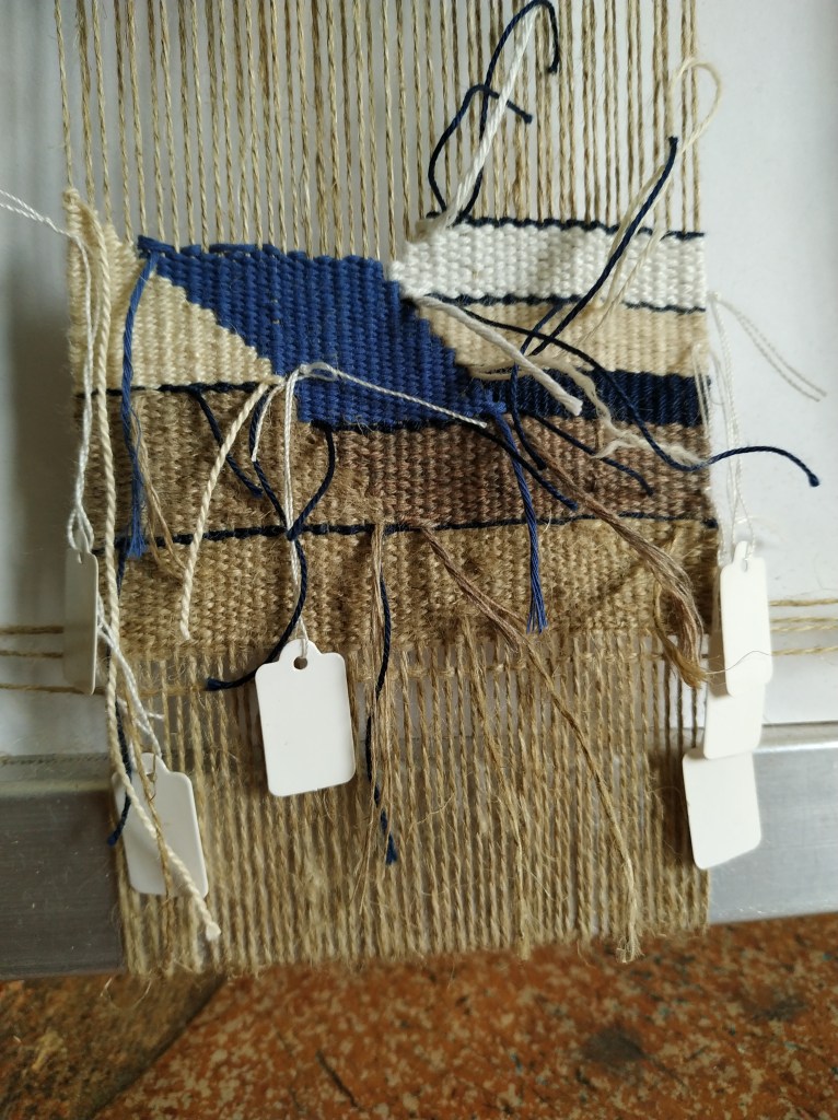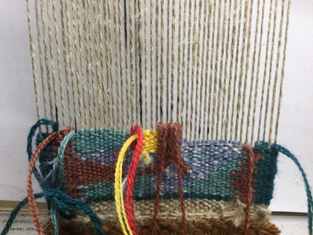 I decided to weave a little doodle I made, but I gave myself different rules. Rule number one : I do it the Ruth Manning way, no cartoon, just looking at the doodle. ( I cheat a little). The goal is for me to learn to draw with wool, to anticipate and understand forms. Rule number two : no ends, the Sarah Swett way. Rule number three : weave from the front ( it goes with the nimber one, drawing with wool). Adding to that, there’s a lot ofvertical lines, so I’m trying to interlock them the scandinavian way, but I’m not very rigorous. But rigor is not made for doodles! You’ll see it done next week, hopefully.