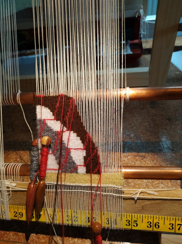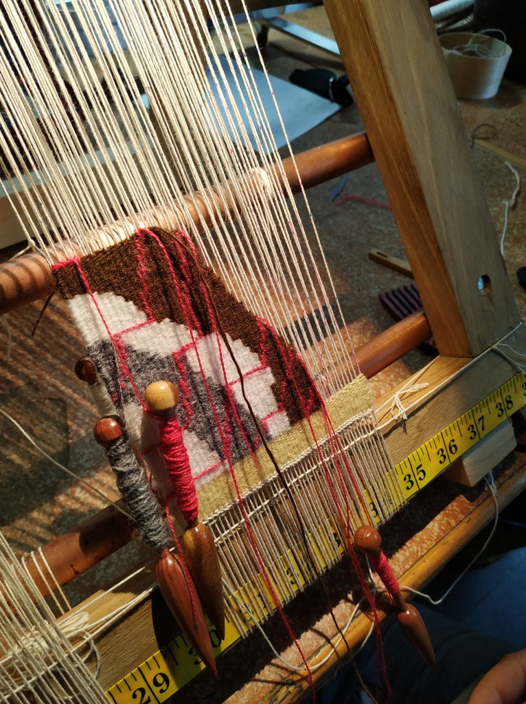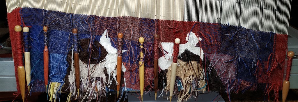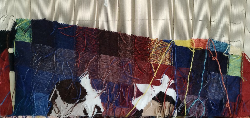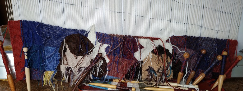 It’s now going on smoothly (except for small weaving flaws…). I need concentration to weave so many interlocks, in this part of the design, it’s intelocks all the way along, for three rows. I will soon begin the row before last, the colors are ready. I already know I won’t be really satisfied with this piece, but I do will be proud of myself for finishing it.
