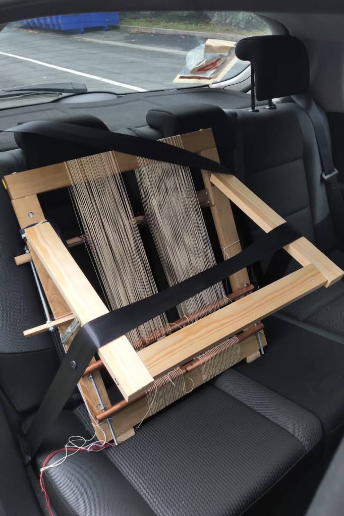 Celina is exercising before beginning her big piece. As you see, her sample is as beautiful as a real piece! She is doing lines with sumak, following the book of Mette Lise Rossing. She is experimenting with different lenght and thickness of thread. And when she gets back home, her husband made loom is secured t the back of the car!