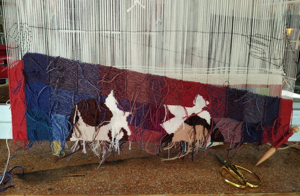 Celina s’exerce à tracer des lignes en soumak ( ou driadi à Aubusson), avant de se lncer dans son projet. Et quand elle rentre à la maison, le Frerech est bien attaché à l’arrière!