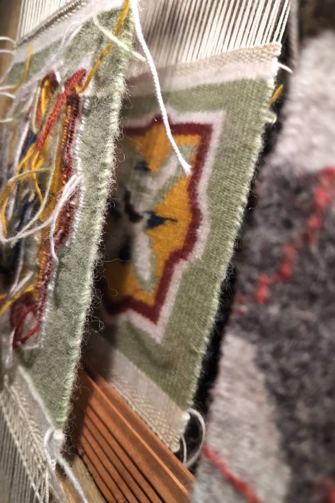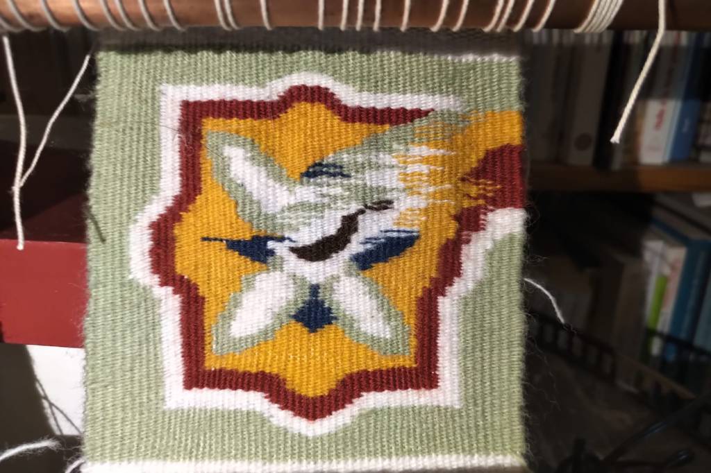 Celina has decided to make a serie of tiles, from Turkish or Spanish or Moroccan books of tiles. She wove this one on her Olivier’s home made loom, but was not so happy of it. Symmetry is hard to manage on a small loom. So as the symmetry was going away, she decided to let it go, and slip, and here’s the result, beautiful!