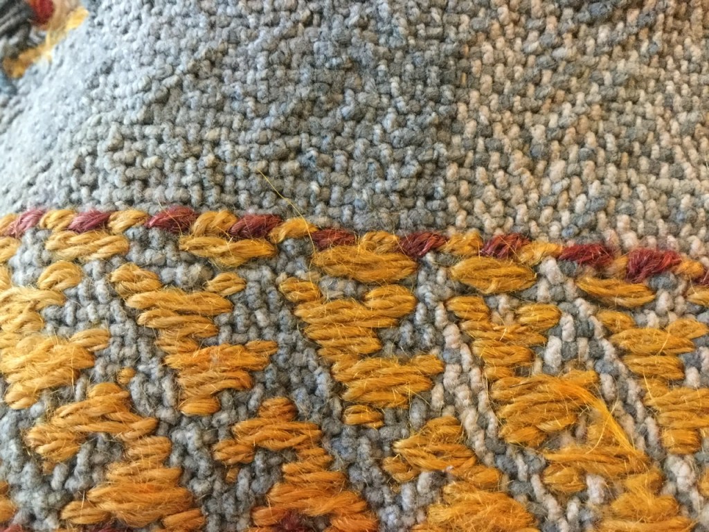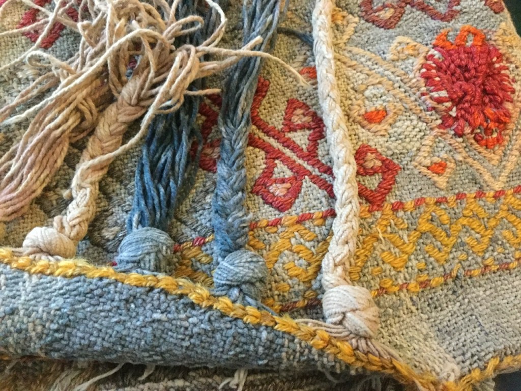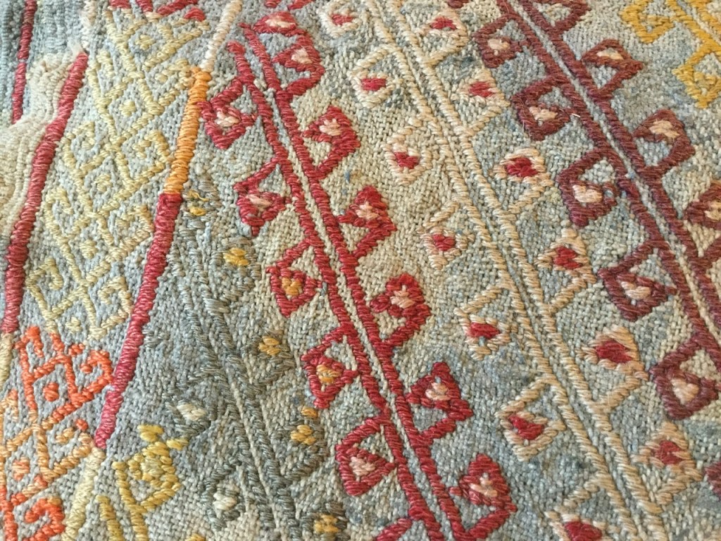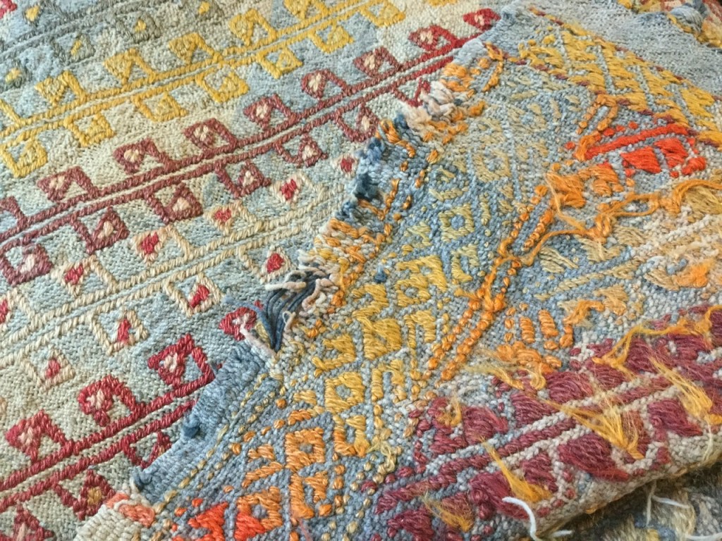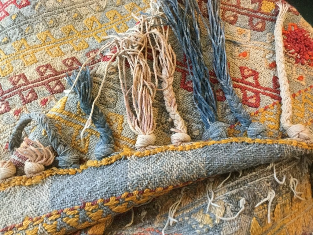Je déménage dans quelques mois, et je commence empaqueter. Je redécouvre ceux de mes kilims confinés dans une boîte. Je n’adore ni les motifs ni les couleurs de celui-ci, mais je reste fascinée par le tissage et le tressage. Je pense qu’il vient de Turquie, il a entre 60 et 100 ans à mon avis.