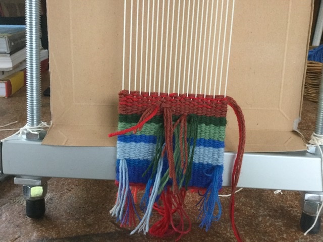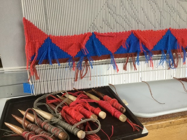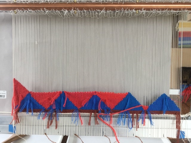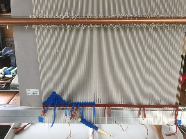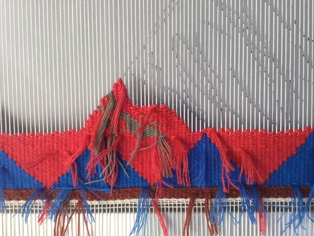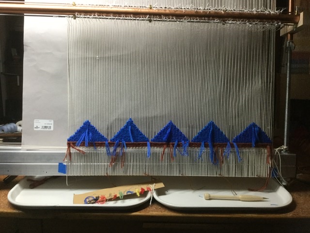 The sampling phase is over, weaving has begun. Weaving at 6 epi is quick, and I like it. I had to figure out how many threads for one bundle, as the yarn have different thickness. I found the way to weave my triangles. And now I’m experimenting the aspect of the background.