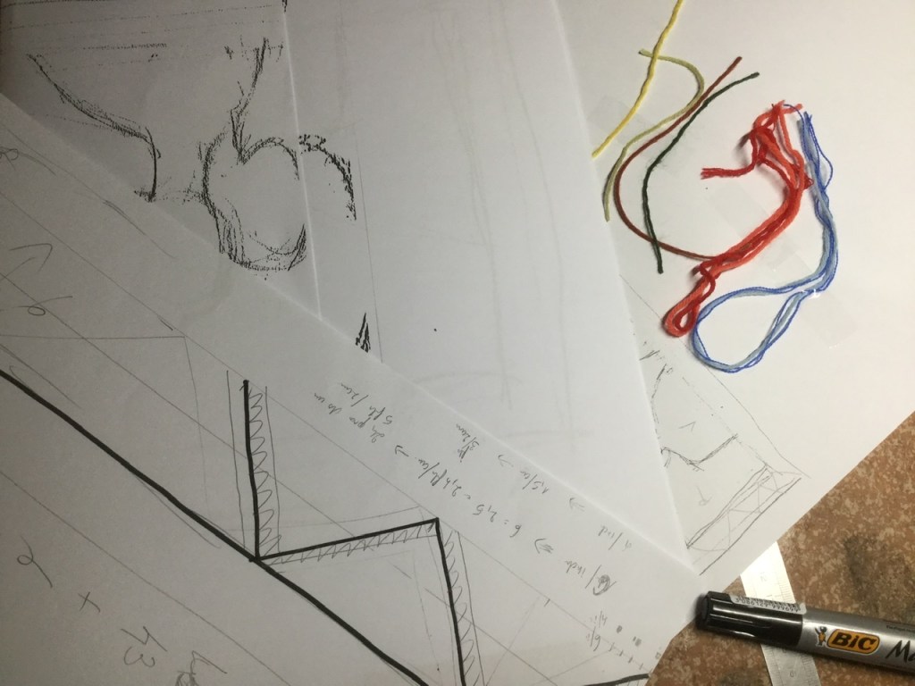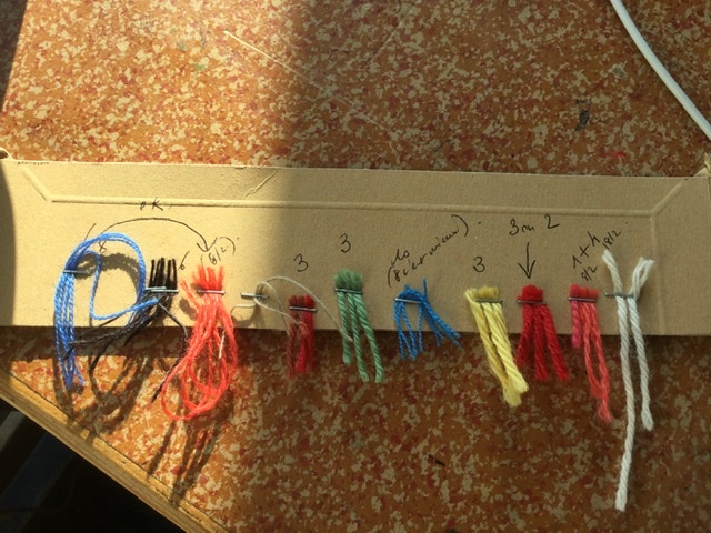Finalement, pas si simple….Je vais travailler avec des laines que je ne connais pas, il me faut donc faire des échantillons pour voir comment elles se comportent, et combien de fils pour chacune d’elles. En plus, une de mes couleurs principales est une laine à tricoter, toute molle et élastique, ça va pas le faire. J’ai commandé presque la même couleur chez Weaversbazar, mais il faut que je l’attende! Pareil pour le bleu, l’autre couleur principale, j’ai tourné autour de plusieurs autour de plusieurs pelotes, pour revenir à deux écheveaux trouvés à Aubusson. Pendant que je m’occupe de la laine, ça me donne le temps de réfléchir à mon dessin, qui a de larges surfaces unicolores, que je ne sais pas encore comment animer. Faire des cartons aussi me laisse le temps d’y penser, Et ça me fait plaisir d’avoir la tête prise par des problèmes créatifs.