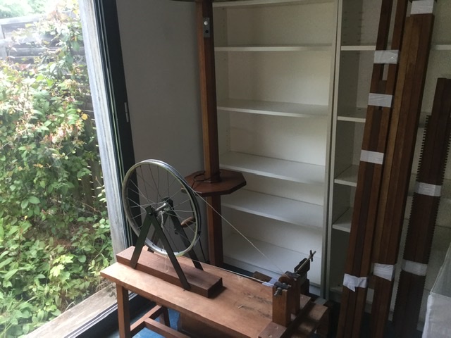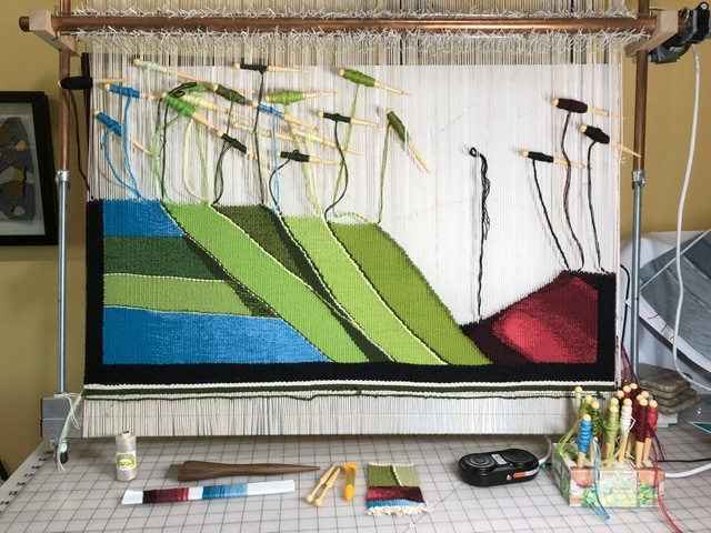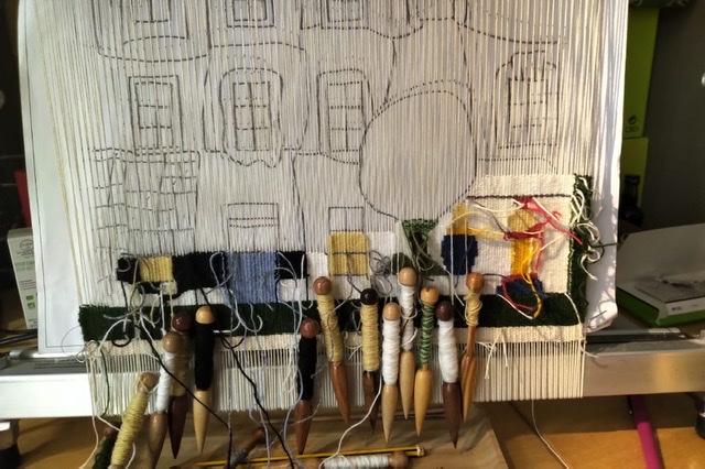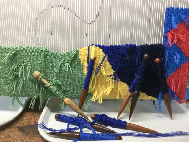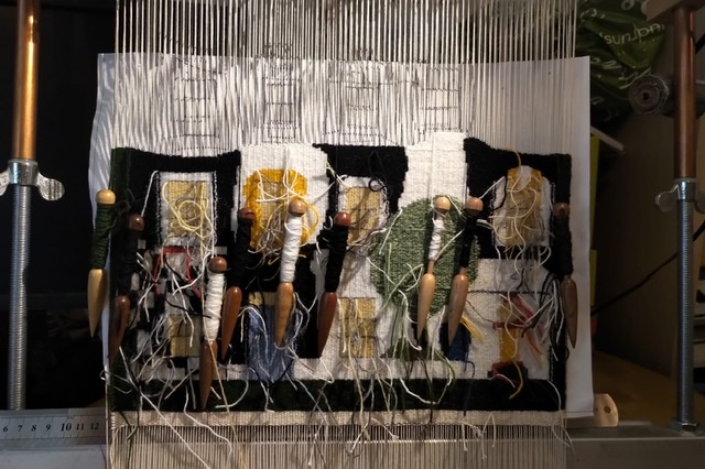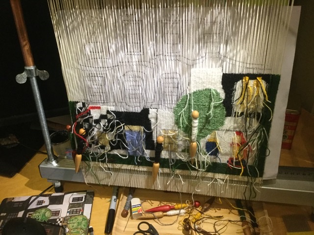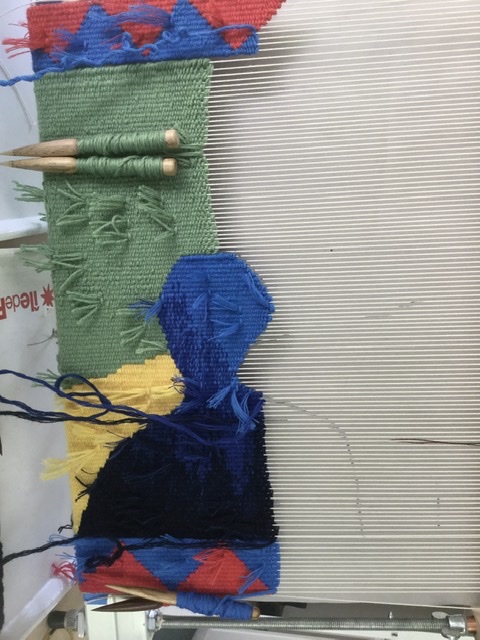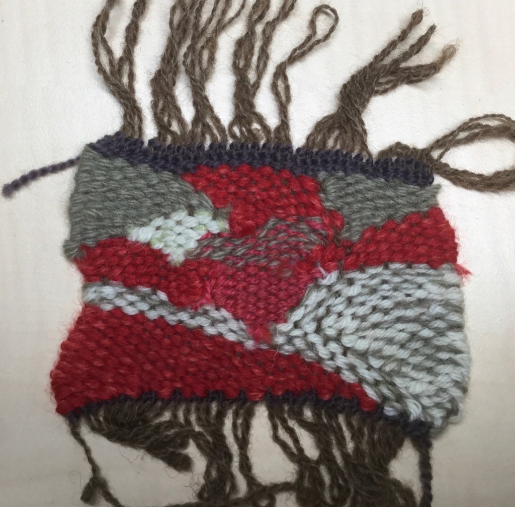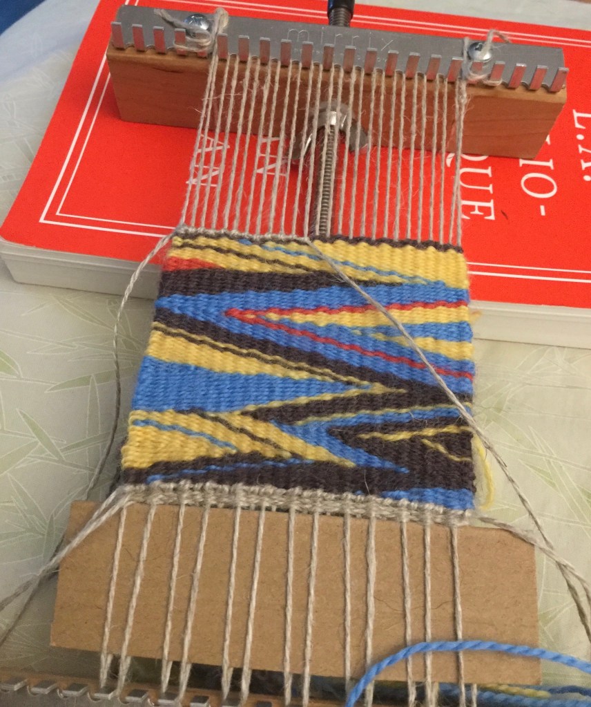Ca faisait longtemps que j’avais envie d’essayer ce qu’on appelle le tissage “dans la forme”, c’est ã dire une trame non horizontale, en fait depuis que j’ai découvert l’oeuvre de Silvia Heyden (https://vimeo.com/25136243). J’ai fait deux tentatives cette semaine, une moche rouge et beige, mais qui m’a permis de comprendre oú je devais aller; l’autre, dans le style Navajo, est plus facile et jolie. Je pourrais en faire d’autres comme ça pour me délasser.