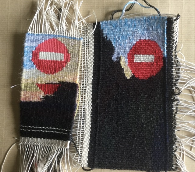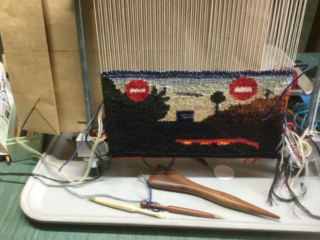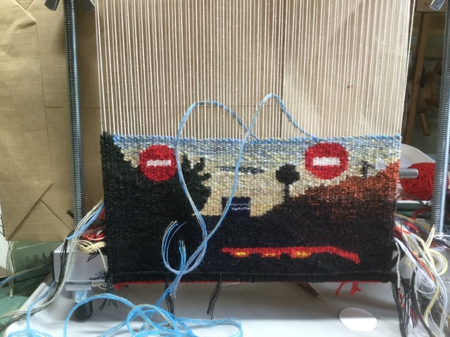 Cette tapisserie vient d’une image captée dans mon rétroviseur un soir en rentrant chez moi. Je me rends compte que ce titre peut aussi évoquer ce moment de ma vie où je prends ma retraite et je fais des bilans. En tous cas, ce moment était superbe et bizarre, et j’ai décidé d’en faire une tapisserie, j’ai vite pris une mauvaise photo, avec les voitures qui s’impatientaient derrière moi.