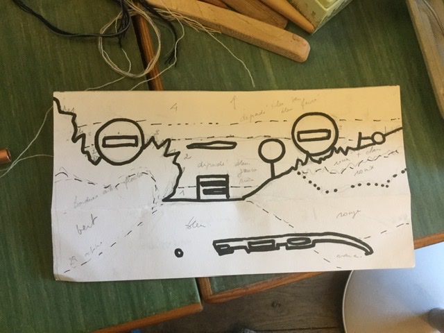 J’ai fait un carton, et des essais, car je craignais les cercles des sens interdit. Comme j’avais raison! Mes panneaux ne sont pas ronds, mais au bout de 4 tentatives j’ai lâché l’affaire et accepté mon échec. Il y avait une autre difficulté, le dégradé du soleil couchant, je l’ai refait cinq fois, et j’en suis maintenant assez satisfaite.