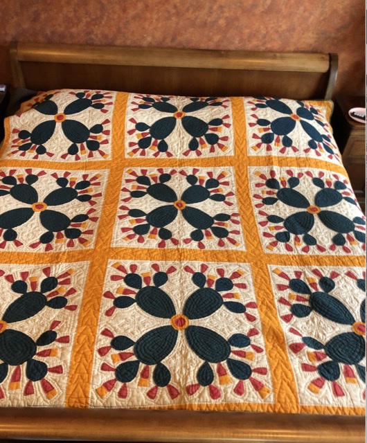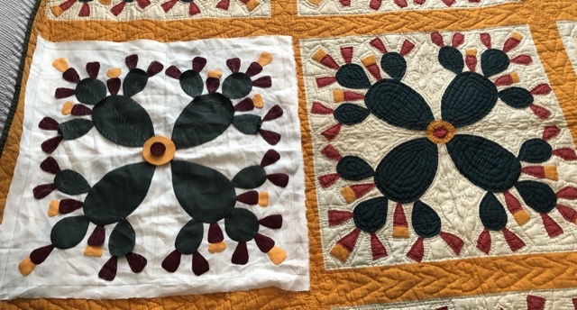 Jon est l’heureux propriétaire d’un patchwork de famille, et il a voulu savoir comment c’était fait. Quel meilleur moyen que d’essayer de le reproduire? C’est ce qu’il a fait, et voici le premier carré. Va-t-il faire l’édredon entier, je ne sais pas et lui non plus à mon avis!