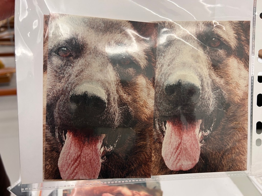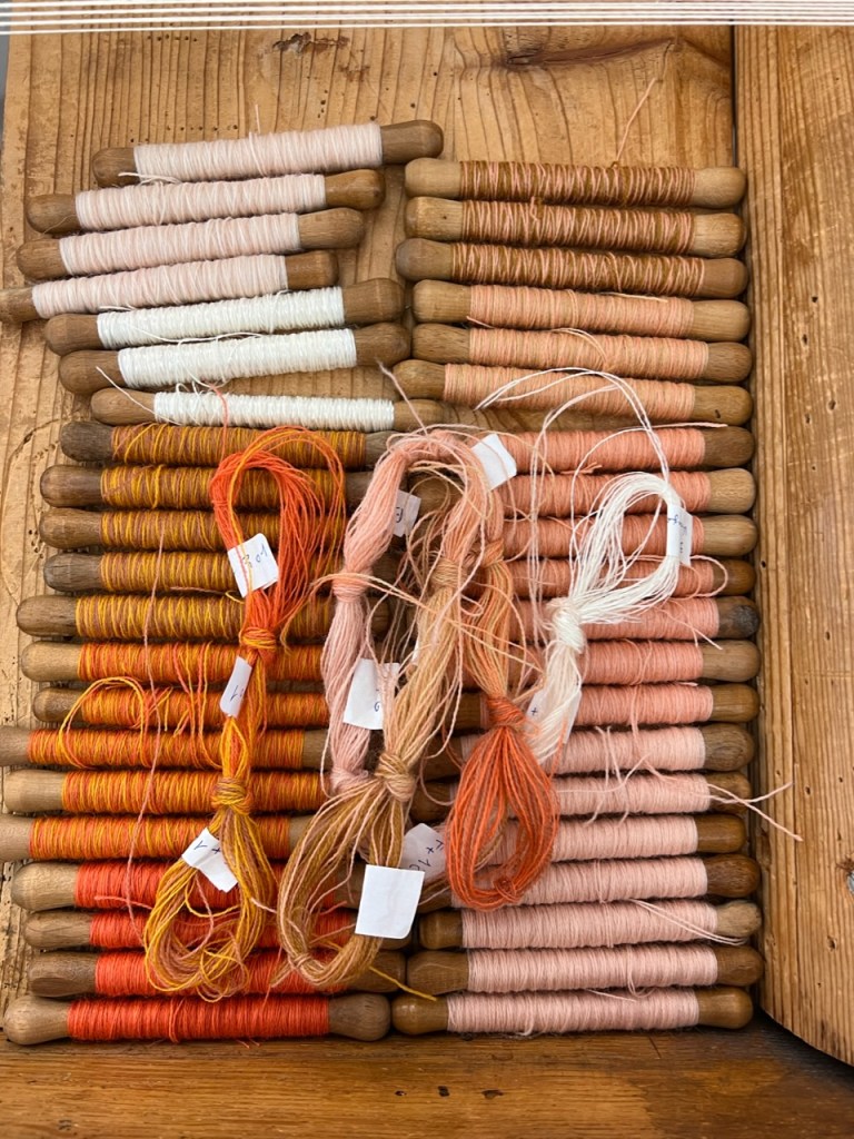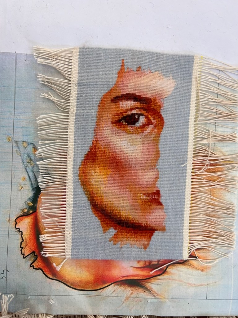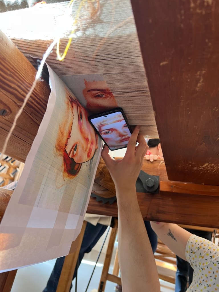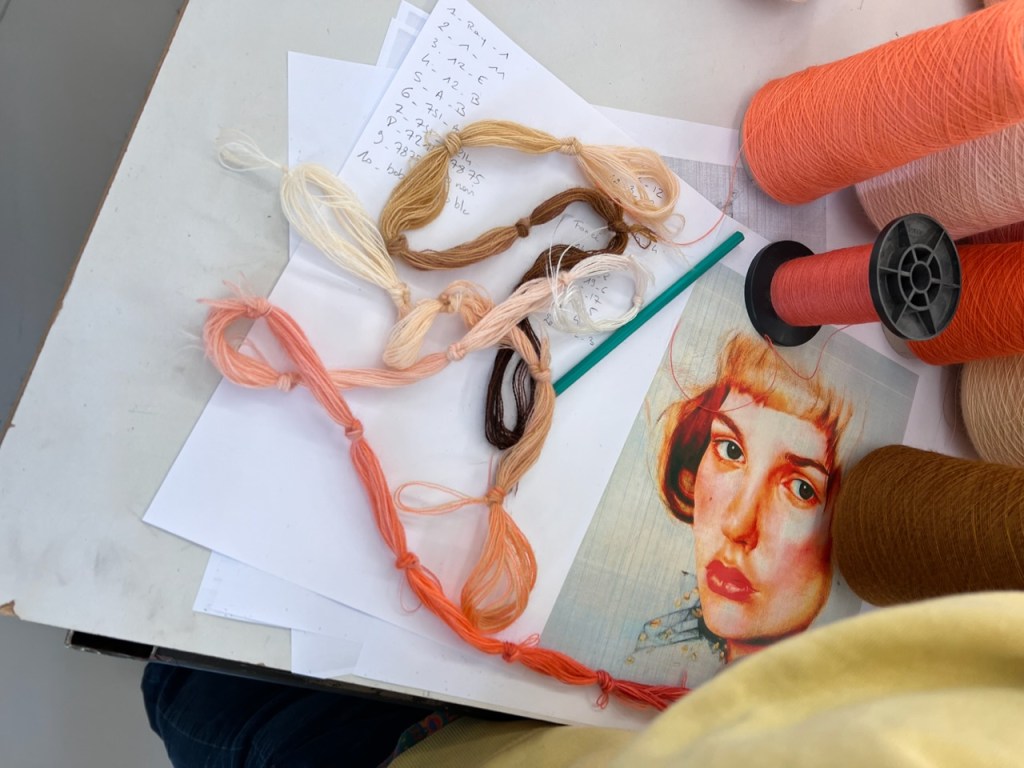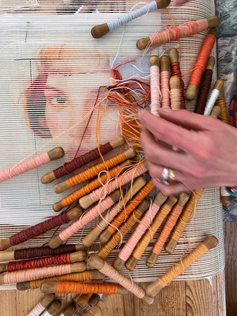 Nous étions 9, toutes des licières professionnelles sur basse-lisse à part moi. Nous avons d’abord choisi nos couleurs, organisées en chapelets comme il est de coutume à Aubusson. Puis sans carton dessiné, la photo a été placée sous la chaîne, et chacune a tenté de reproduire les nuances et subtilités de la peau. Nous avons travaillé dur pendant cette semaine, mais seules deux d’entre nous ont terminé de tisser le visage (ce n’était pas l’objectif principal de toute façon). Alain nous appris à regarder attentivement, à discerner les parties les plus claires et les plus sombres, à construire une gradation de couleurs et à utiliser avec pertinence les battages, les rayures et le driadi. (On tissait à 7 fils au cm)